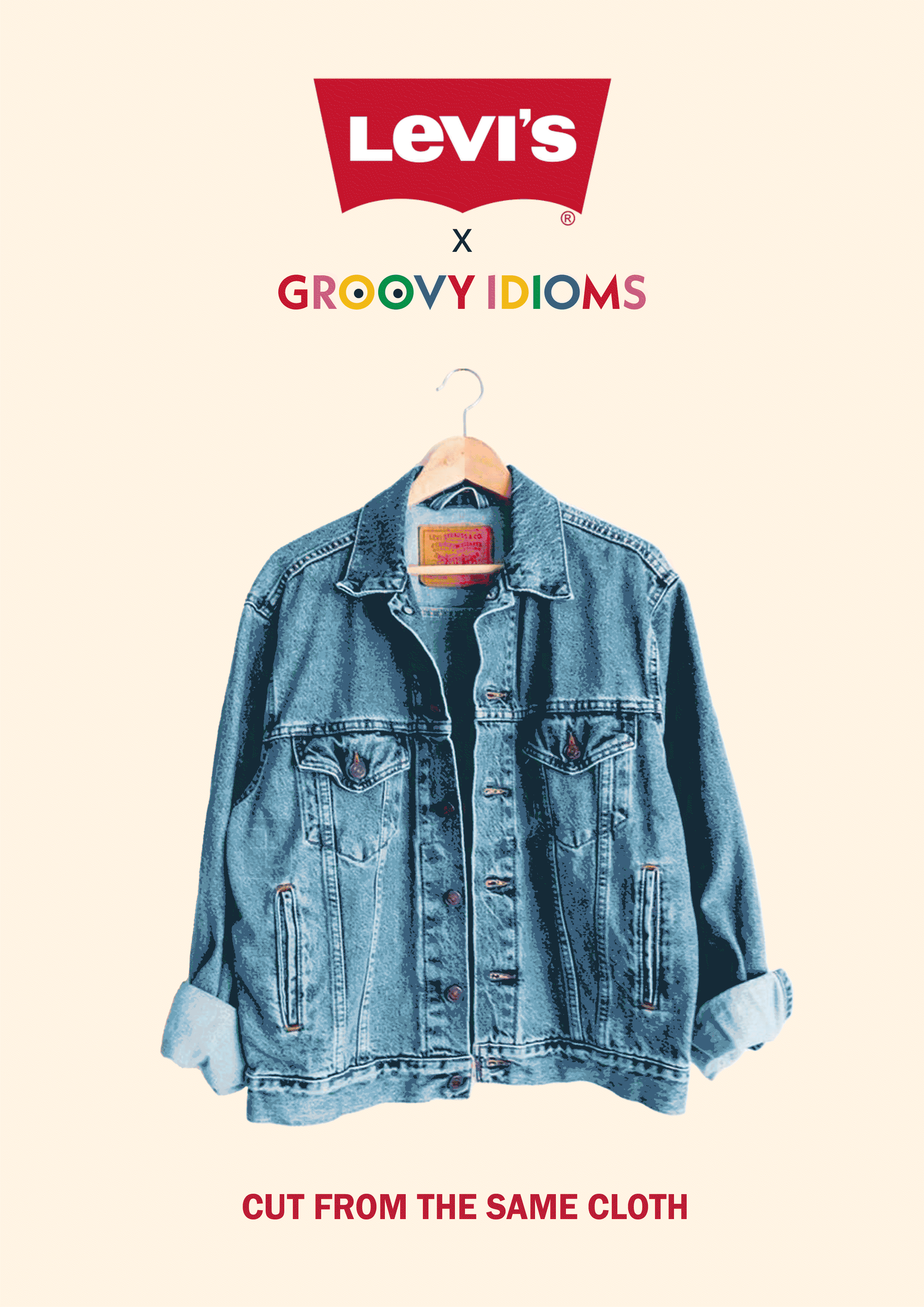 The collaboration expresses the idea that Levis is for everyone, no matter how different we are. The Groovie Idioms patches stand for the belief that we are all flawed and can make mistakes, which can be communicated in our daily lives through idioms.